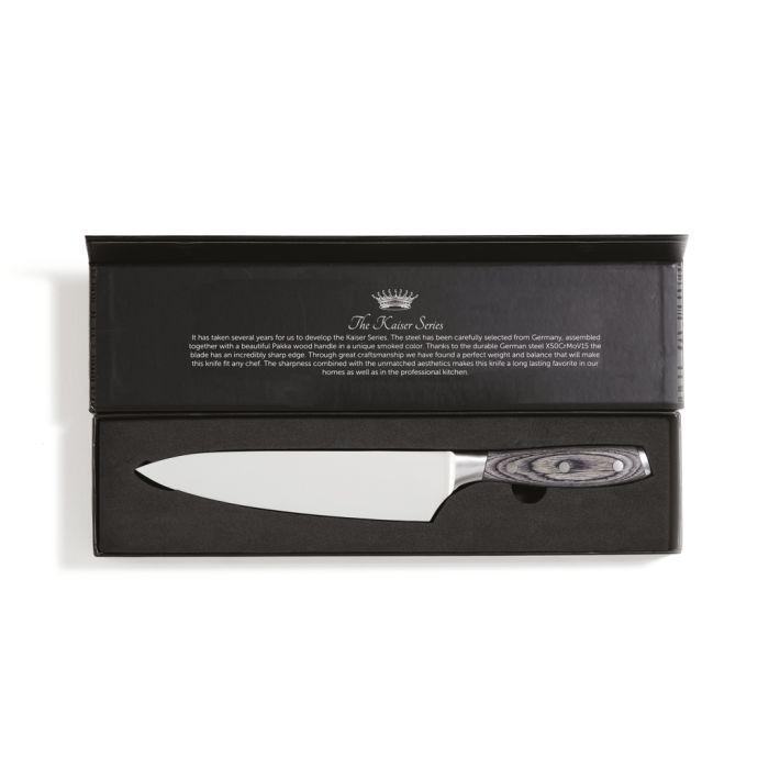 VINGA Kaiser Chef´s Knife. Chef's knife made of X50CrMoV15 German steel with a Pakkawood handle. The easy-grip handle and superb balance in the blade makes the knife comfortable and easy to work with. Size: 20 cm blade.