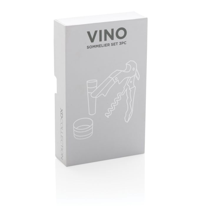 Printed Vino Sommelier Wine Gift Set. Have everything you need to open and serve your favourite wines with this 3 pcs wine set. The set consists of a waiter`s corkscrew, foil cutter and drip ring. Packed in a luxury gift box.