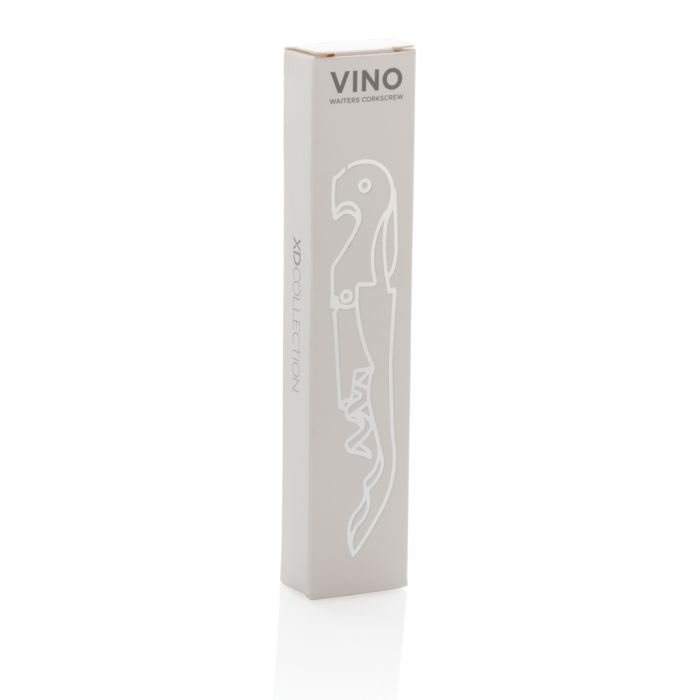 Branded Vino Waiters Friend Corkscrew. This waiters corkscrew is a classic corkscrew design that has a foil cutter blade, a two stage cork lifter and bottle opener. Packed in gift box.