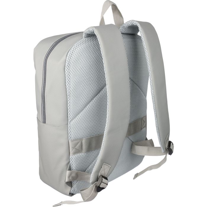 Laptop backpack (15 inch) with two zipped front pockets and a large zipped main compartment with a Velcro-closed laptop section. Ventilated padded back with a trolley strap and adjustable shoulder straps.