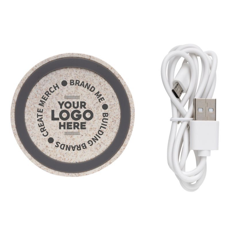 Promotional Wheat Straw Round Wireless Charging Pad. Wireless charger made from wheat fibre (30%) mixed with ABS to charge all wireless devices. With silicone ring that prevents your phone from sliding around. The LED indicator will light up when the device is charging. Compatible with all QI enabled devices like Android latest generation, iPhone 8 and up. Input: 5V/1.5A. Wireless Output: 5V/1A, 5W. Including 50 cm PVC free TPE micro USB cable.