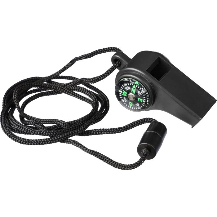 Whistle with a compass and thermometer. Thermometer displays in Celsius. Includes a 100cm polyester neck cord with safety buckle. Individually packaged in a brown cardboard box.