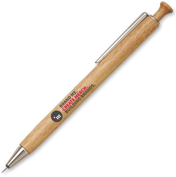 Promotional Woodone Pencil. Made using wood sourced from responsibly maintained sustainable forests, the Woodone retractable pencil has a barrel and push button made from birch wood that complements its chrome metal tip and clip. Excellent print area on barrel.