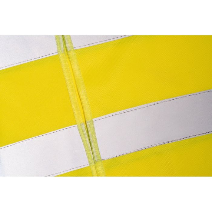 100% polyester high visibility vest certified with EN ISO 20471 class 2. Reflective vest with 2 horizontal reflective bands and a self-adhesive hook and loop fastener front opening. One size: 670 x 700 mm